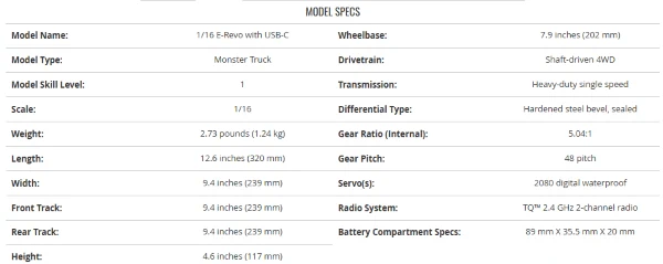 ה‑E‑Revo 1/16 היא מכונית מונסטר חשמלית בקנה מידה 1/16 (12.6” אורך / 320 מ”מ), עם מערכת הנעה 4WD מבוססת קונסולת Shaft‑Drive.