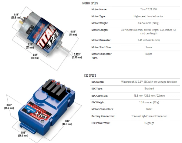ההמכונית מגיעה כ־Ready‑To‑Race® עם שלט TQ™ 2.4 GHz, מנוע Titan® 12T 550 עם מאוורר קירור פנימי ובקר מהירות עמיד למים XL‑2.5™ ,כל אלו מאפשרים כ־30+ מייל לשעה (48+ קמ”ש) במהירות מרבית .